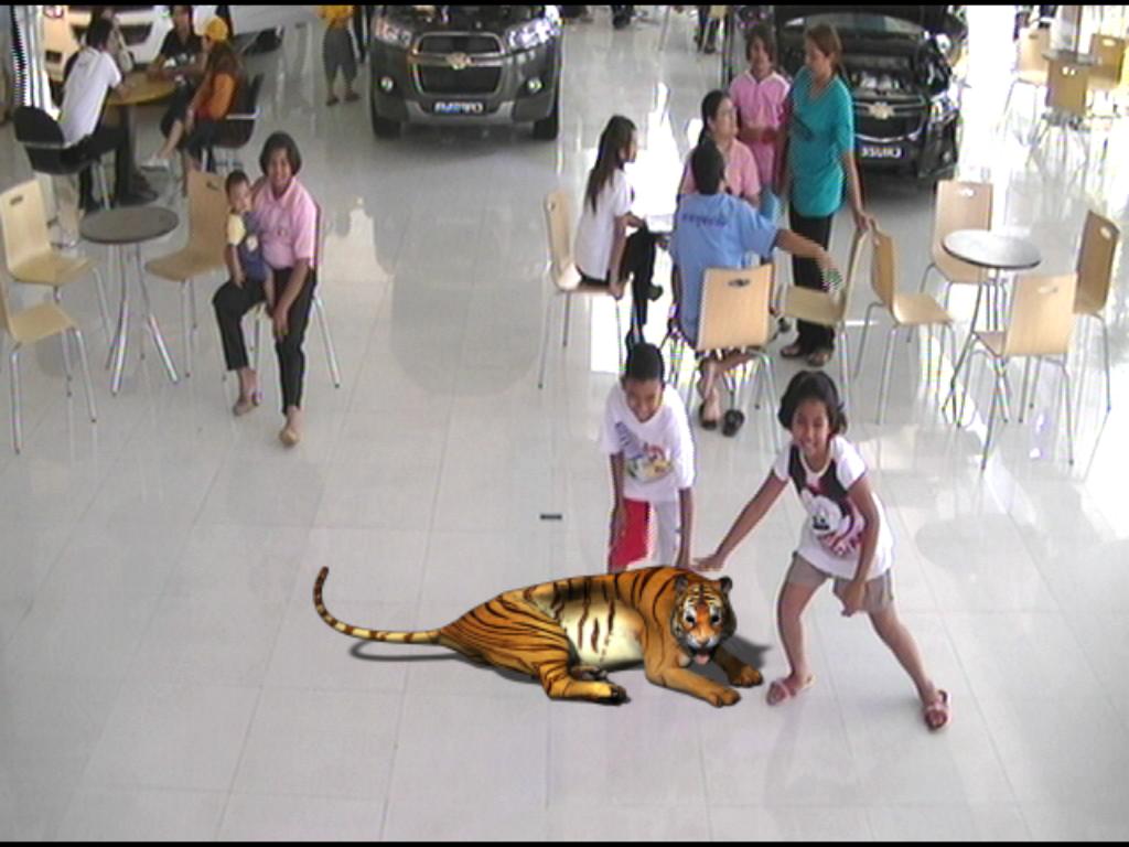 Using HD Video capture linked directly in to our software, the audience will see themselves on the large screen. This alone attracts the attention of passers-by. Suddenly, out of nowhere appears stunningly realistic 3D content which gives the illusion of things appearing right next to the audience and interacting with them.